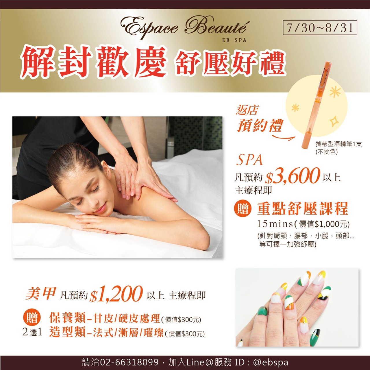 久候的心情,EB SPA都懂,自7/30-8/31止,為您獻上解封優惠。